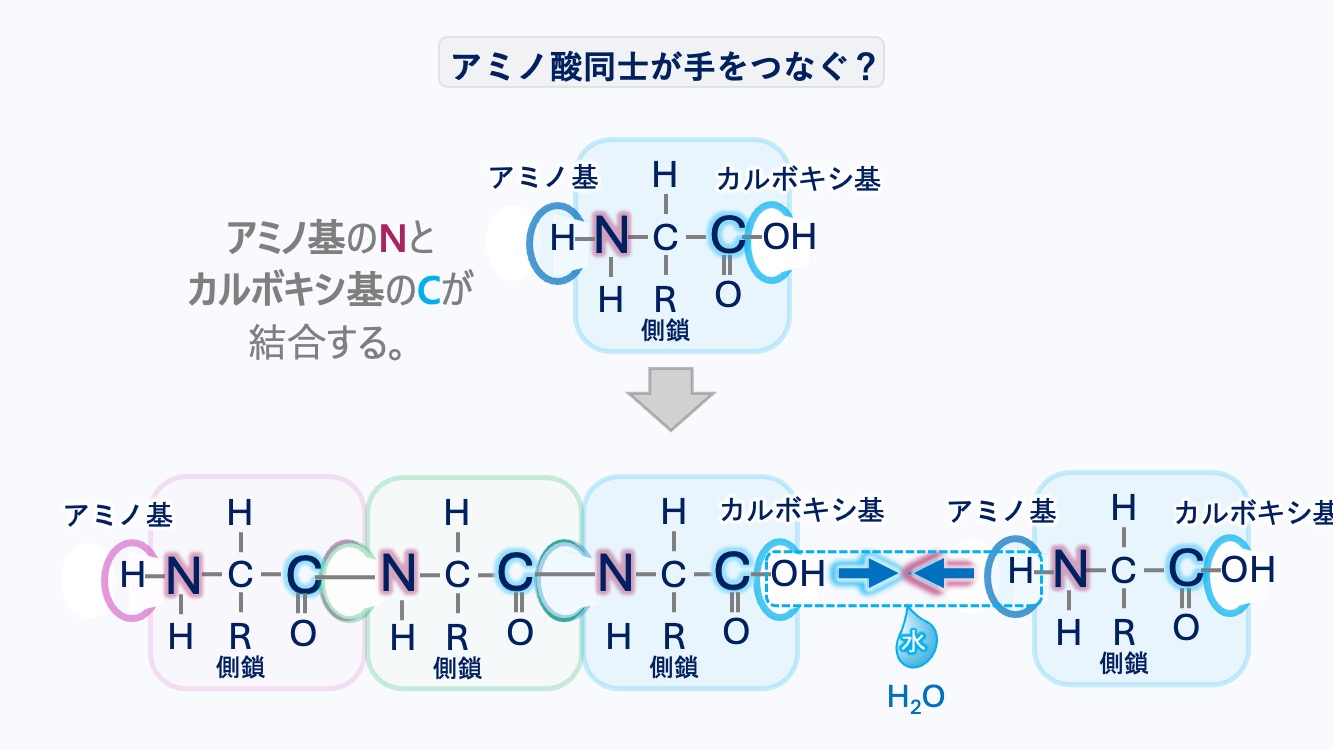 カルボキシ基(C側)に、次のアミノ基(N側)がつながる、を繰り返して鎖が伸びていくんだ。