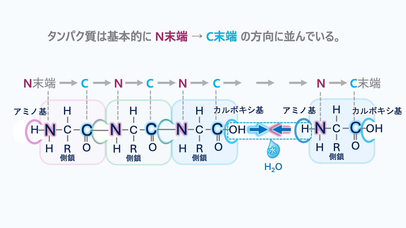 カルボキシ基(C側)に、次のアミノ基(N側)がつながる、を繰り返して鎖が伸びていくんだ。
