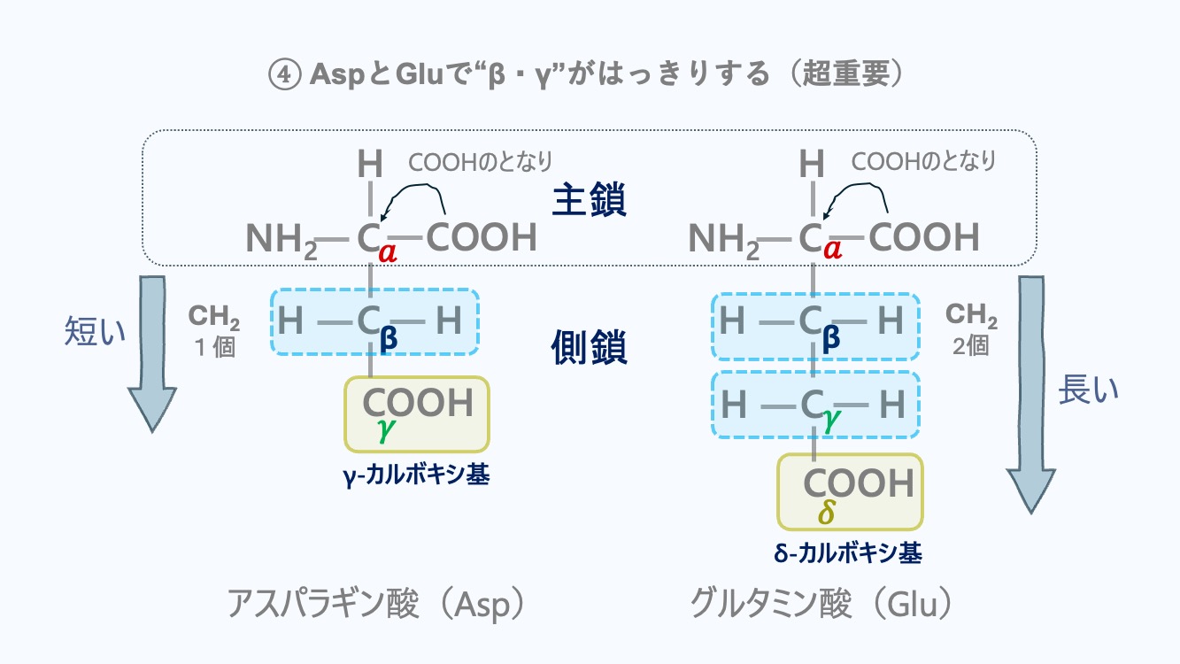 Aspは短い(–CH₂–COOH)→側鎖COOHはγ。