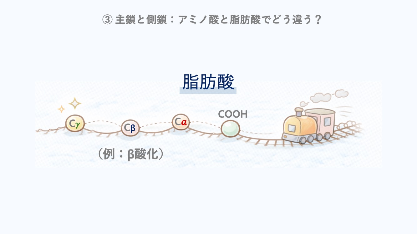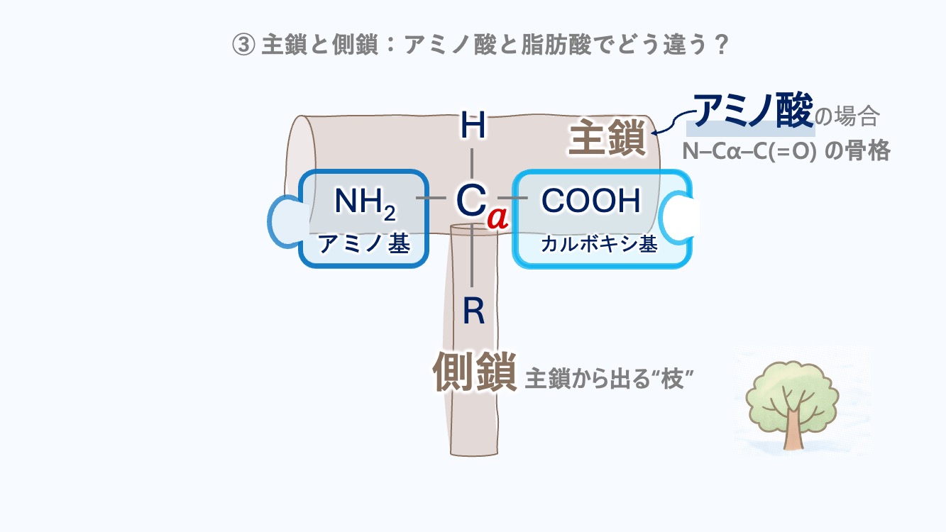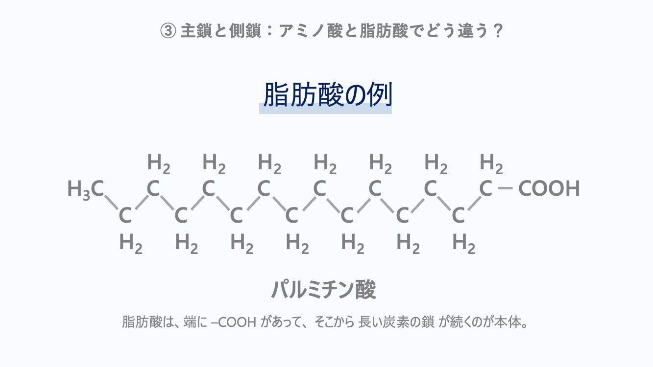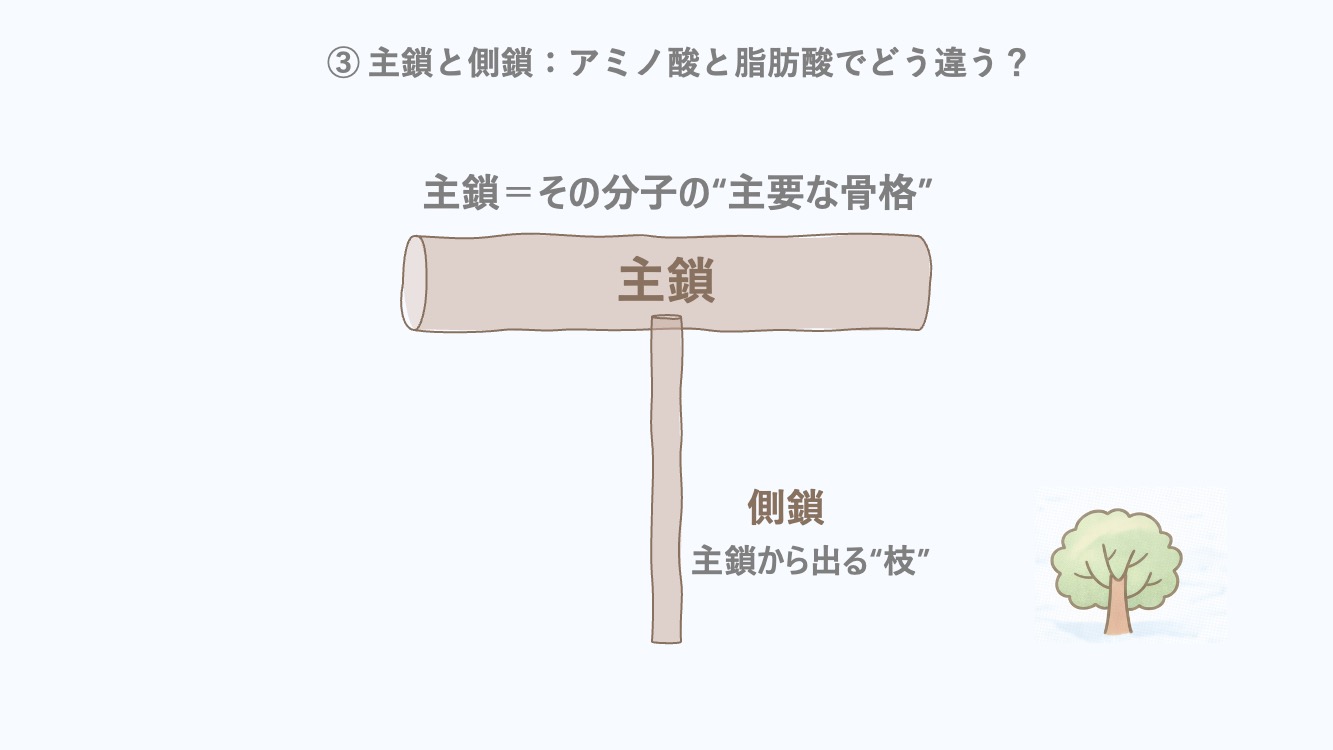 ③ 主鎖と側鎖:アミノ酸と脂肪酸でどう違う?