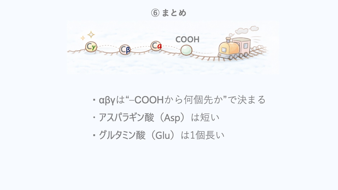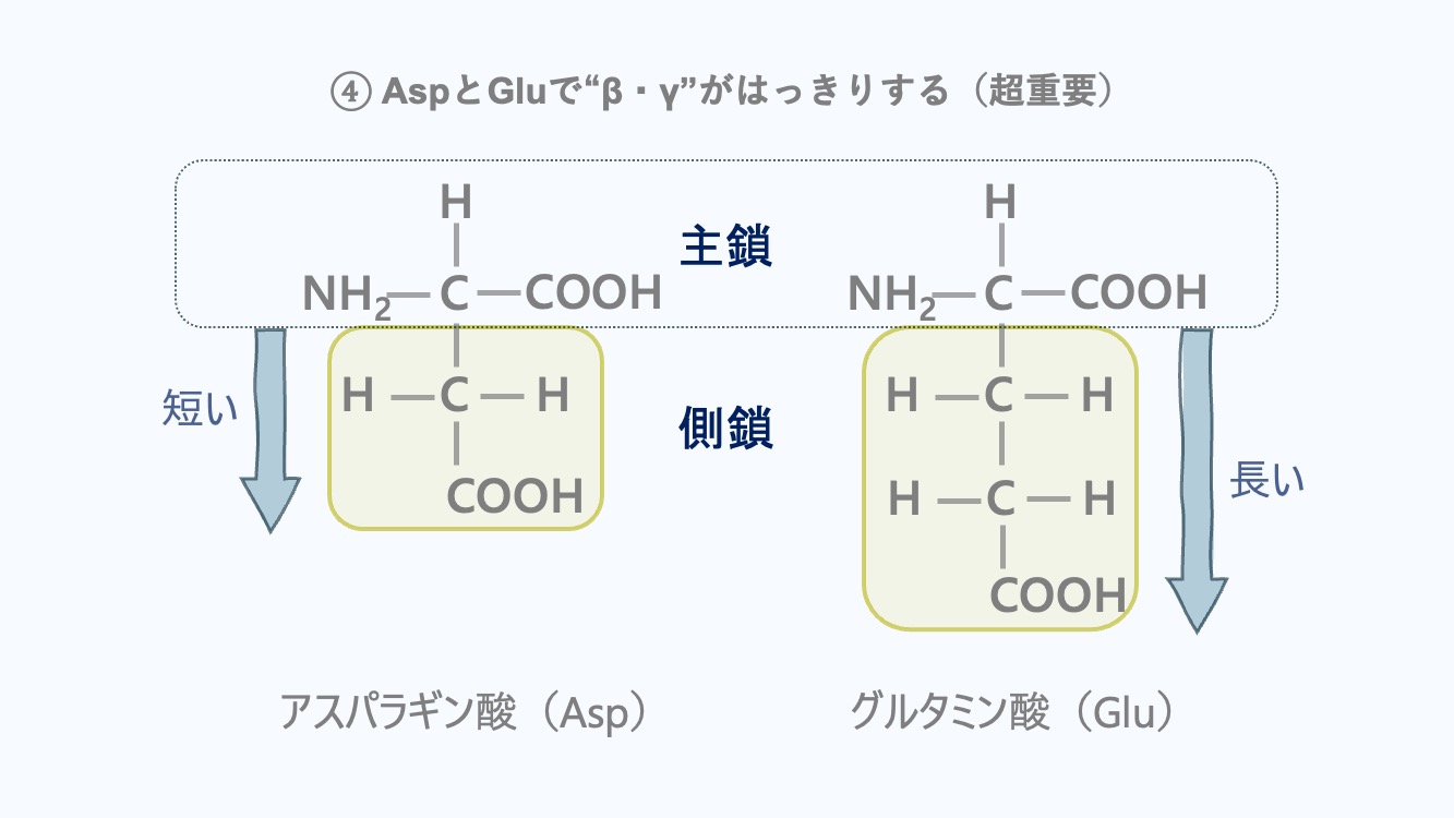 Aspは短い(–CH₂–COOH)→側鎖COOHはγ。