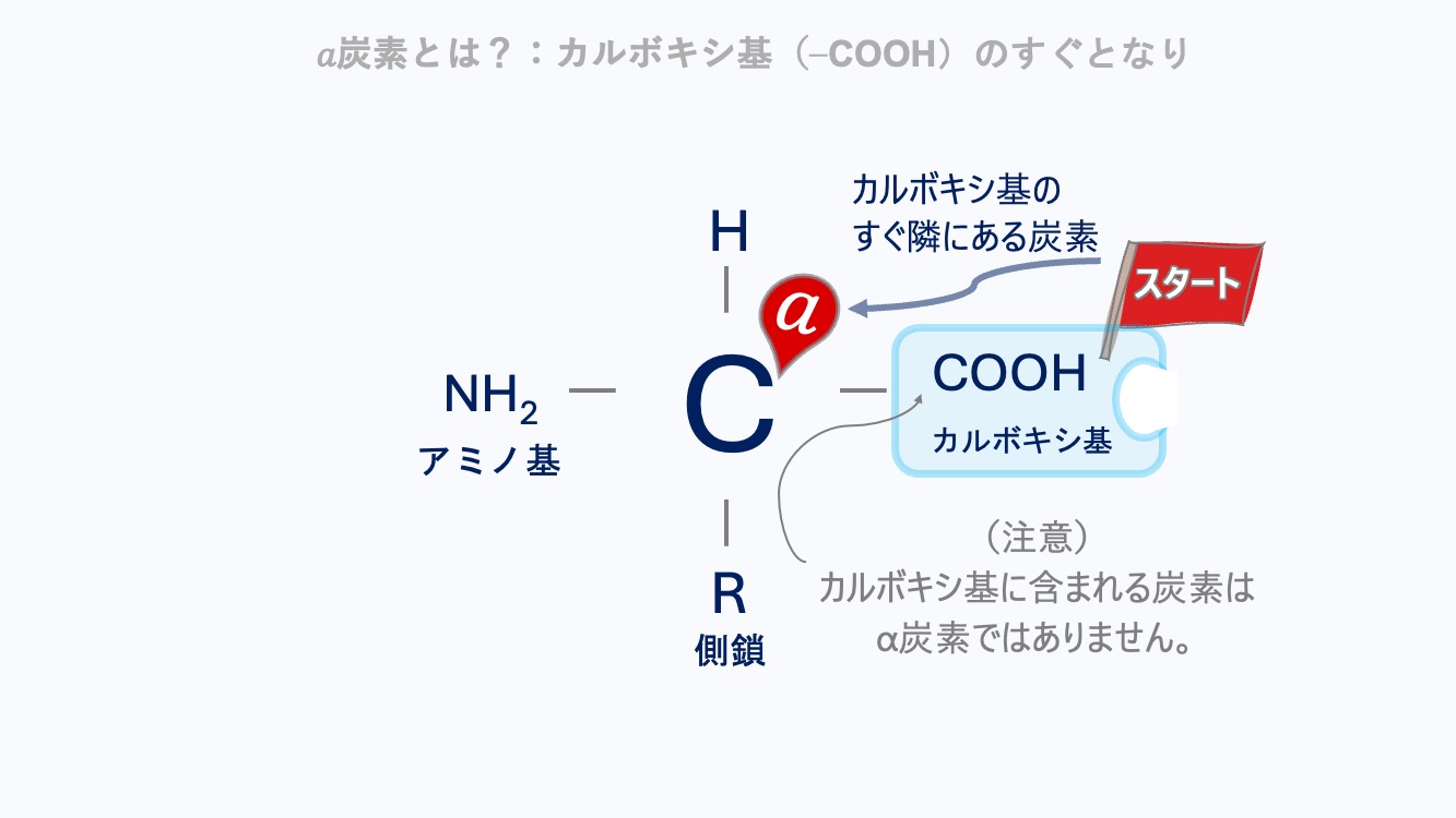 α炭素 と呼ばれるんだ。どうして “α” なのか、分かる?