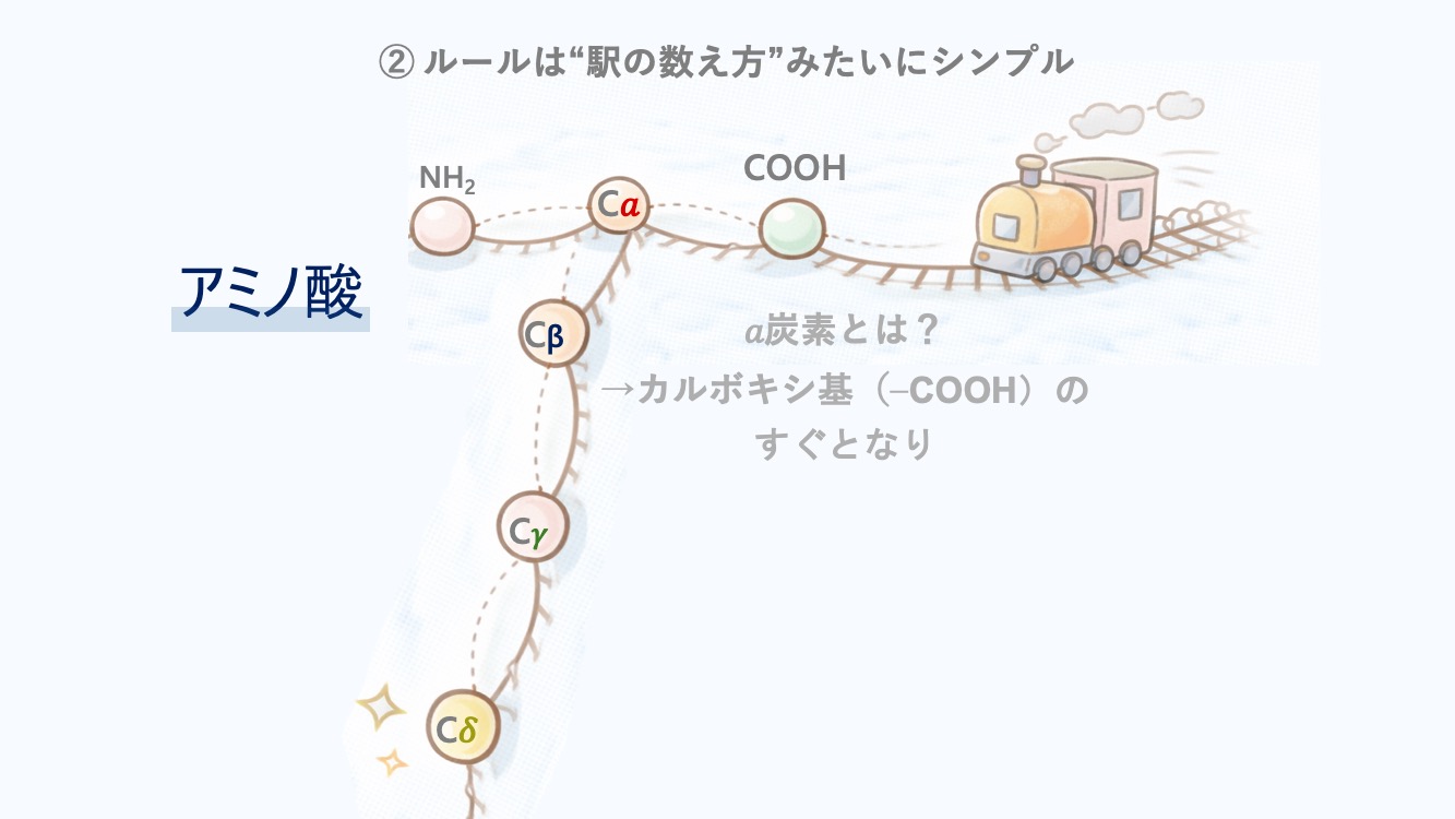 近い炭素から α・β・γ…って名札をつける。だから、アミノ酸だけじゃなくて