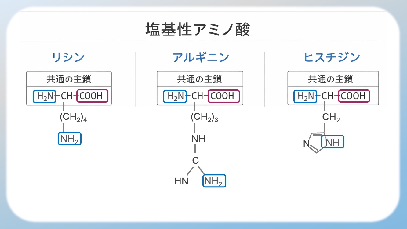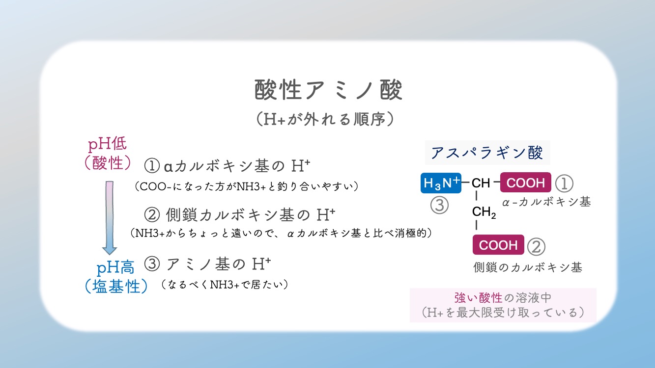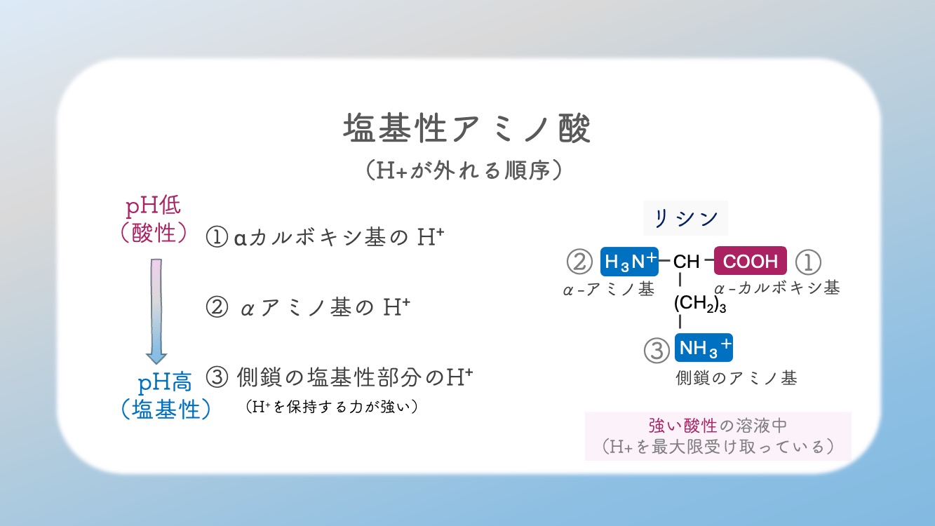 側鎖が H⁺ を受け取りやすい塩基性アミノ酸この視点があれば、かなり整理しやすくなるよ。