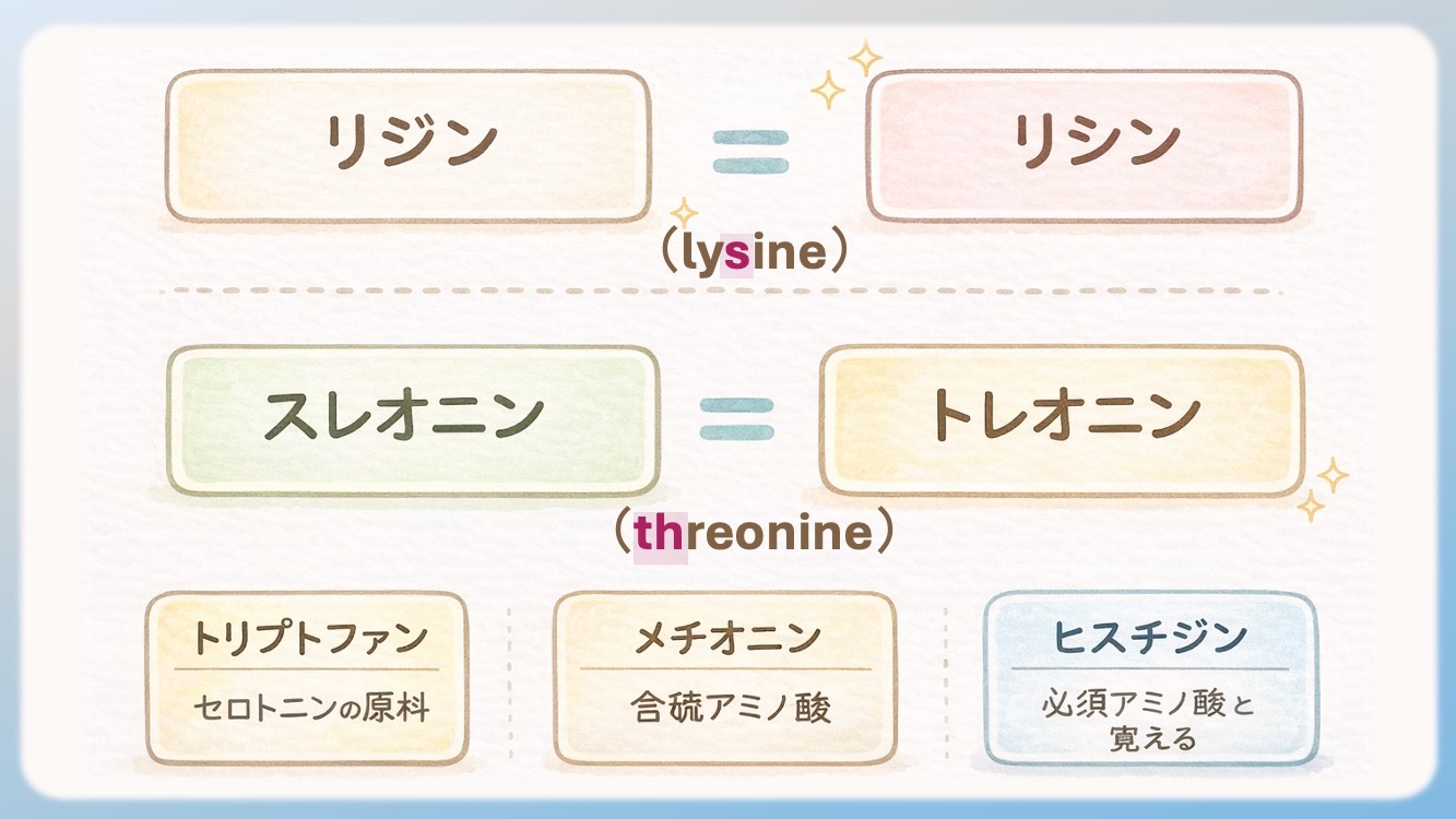 注意:ト;トリプトファン リジ:リジン と、本文の語呂と少し違います。