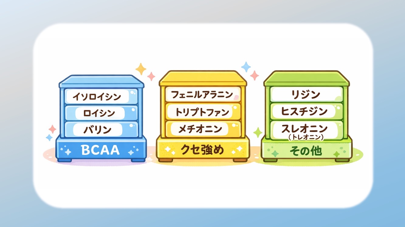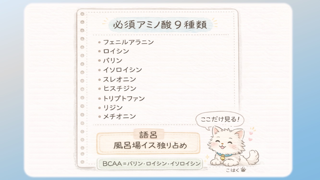 必須アミノ酸(9種類): 体内で十分に合成できないため、食事からの摂取が不可欠