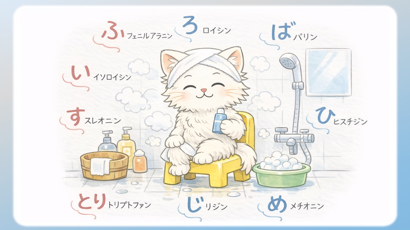 「風呂場イス独り占め。フェニルアラニン、ロイシン、バリン、イソロイシン、スレオニン、ヒスチジン、トリプトファン、リジン、メチオニン。」