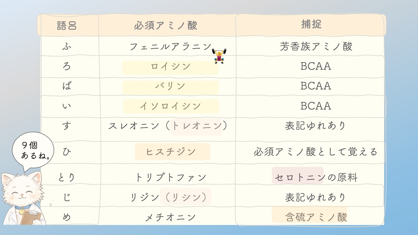 必須アミノ酸攻略クイズ(全10問)で、必須アミノ酸の語呂合わせを